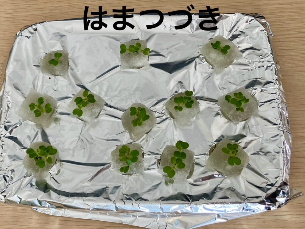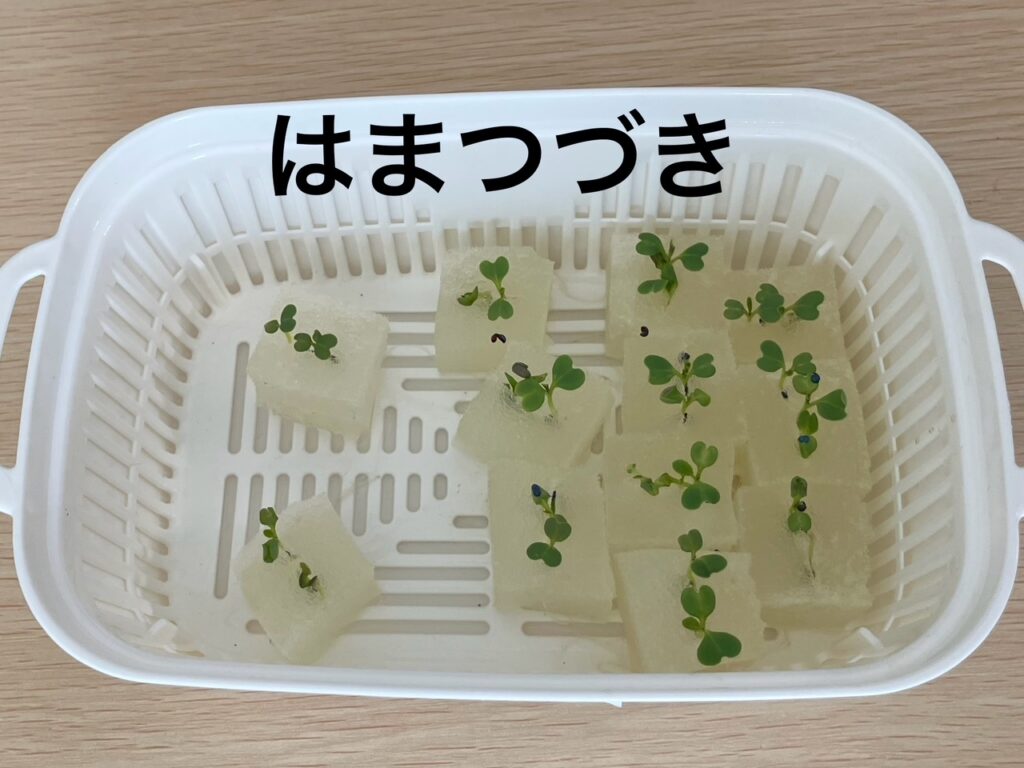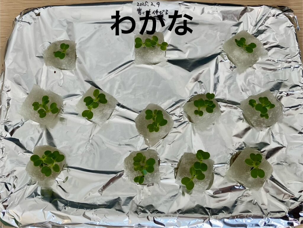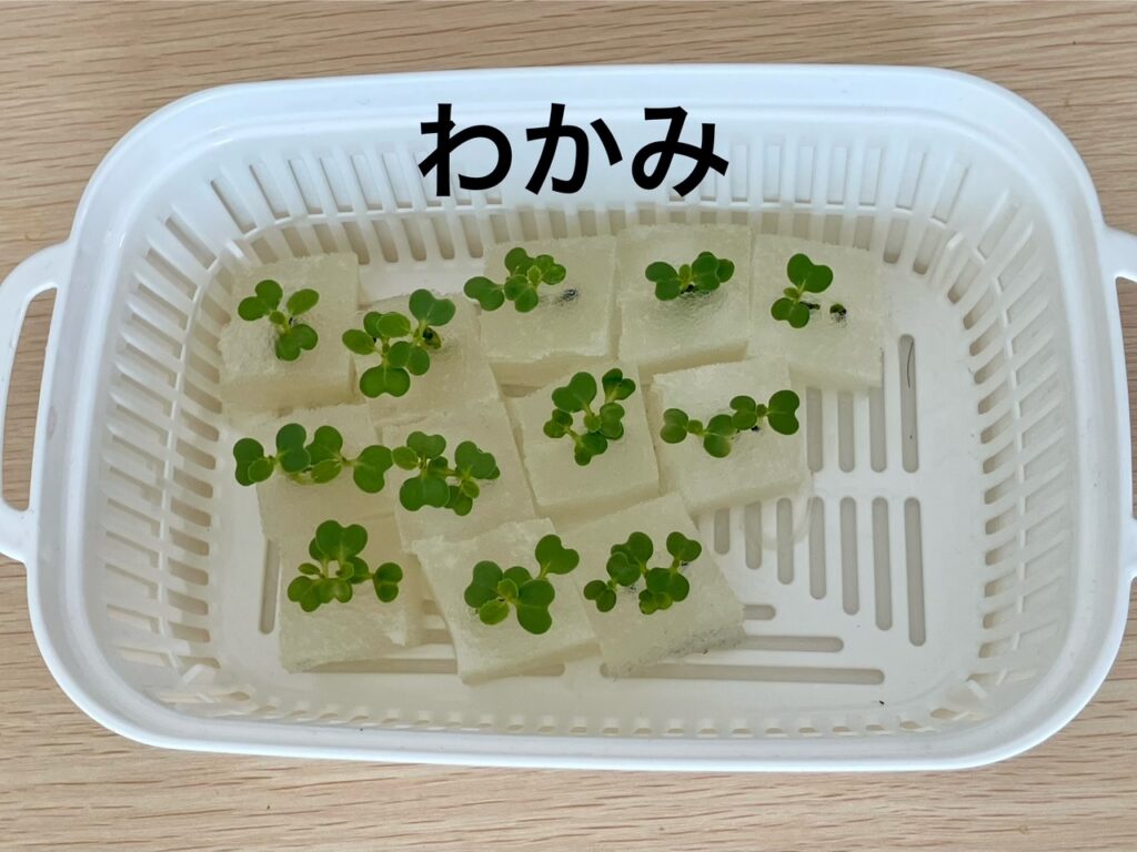 スポンジ1つあたり3粒ずつ種を蒔いたところ、全てのスポンジから発芽が見られました。現在のところ、【わかみ】の方が発芽が早く、双葉の色も濃い緑色で生育しています。