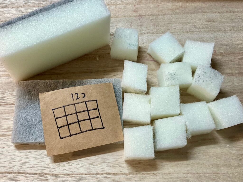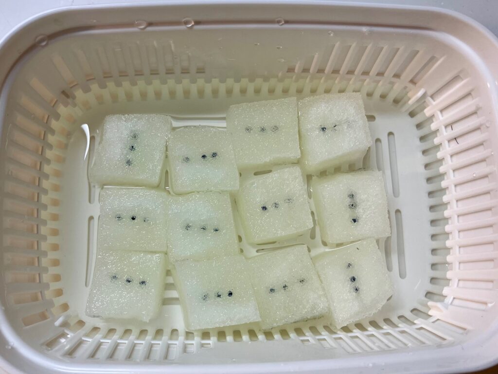 スポンジを約3㎝角程にカットして、切れ込みを入れて種を3粒ずつまきます。