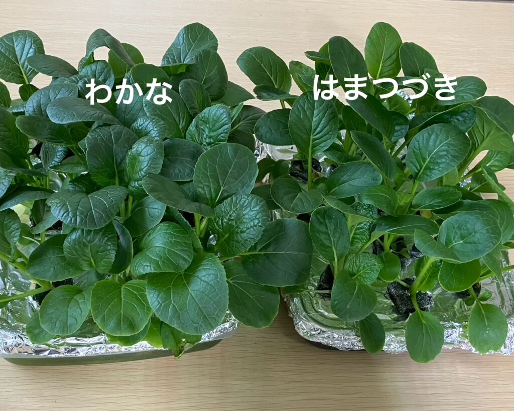 まだ成長途中のため、明確な差は見られませんが、現時点では【わかな】は茎が柔らかく広がりやすく、【はまつづき】は茎がしっかりとしており、葉は【わかな】よりもやや小ぶりであるように感じます。