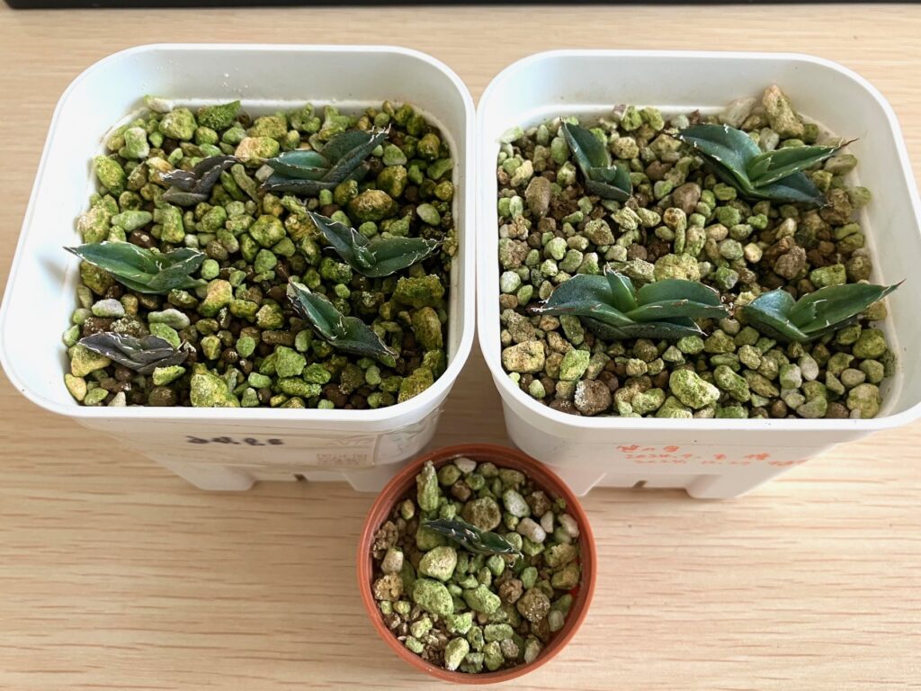 市販の多肉用土に植え替え完了。ひとまず3つの鉢に植え込みしました。