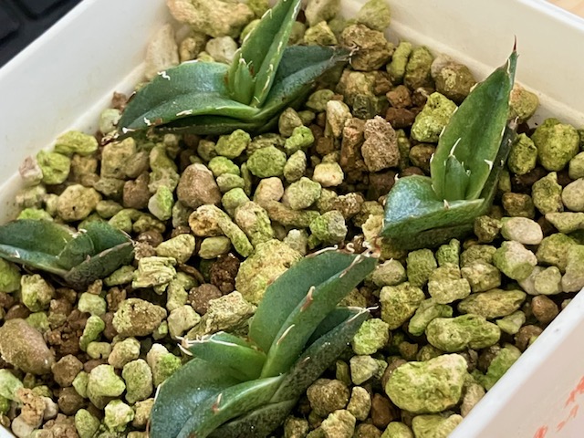 播種から3ヶ月が経ち、発芽した苗はすべて元気に成長しています。アガベらしいフォルムになってきましたが、ペンキとよばれる白い模様はまだ確認できません
