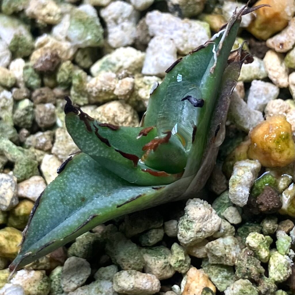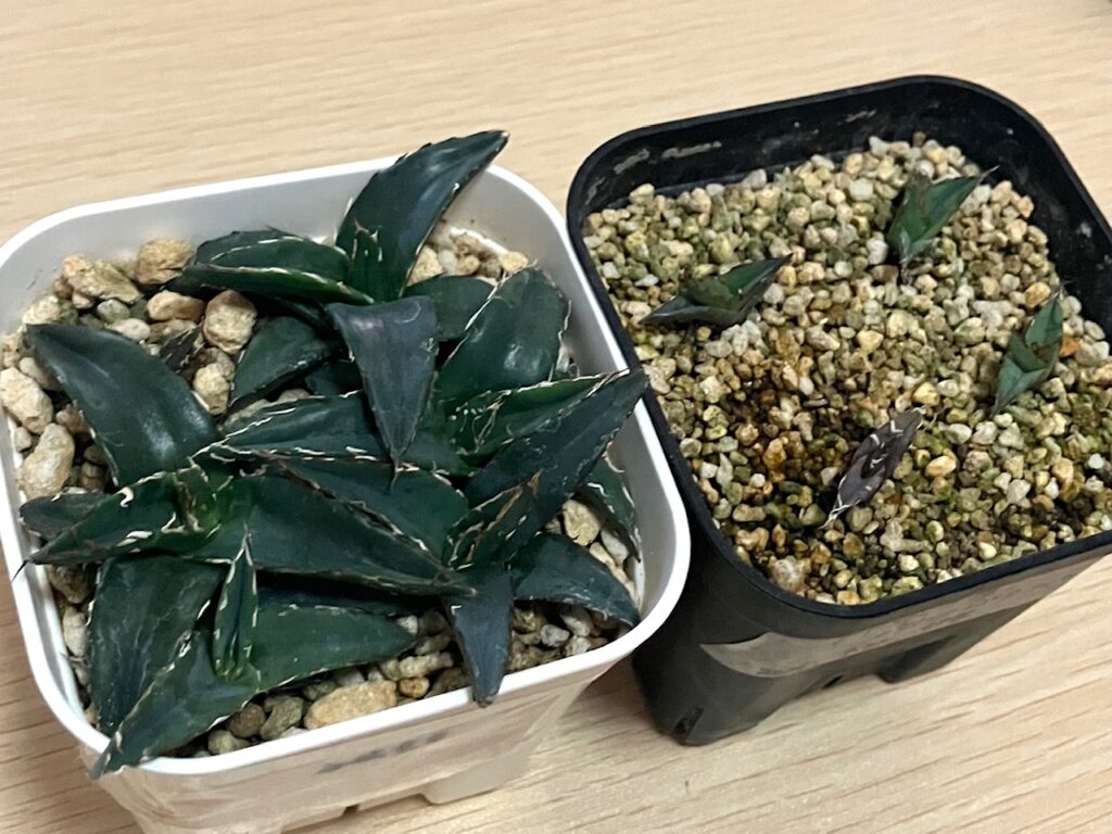 実はこの株、しばらくの間(3〜4ヶ月ほど)は写真左下のアガベのように赤黒くなり、成長が止まった状態でした。 ですが、今年に入った頃からようやく本来の緑色を取り戻し、動き始めてくれました。