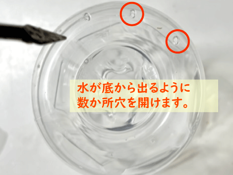 ペットボトルの底に10個ほど5mmほどの穴を開けます。