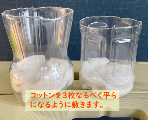 まず、ペットボトルの底に敷いたコットンにしっかり水をかけて染みこませてから、タネをまきます。