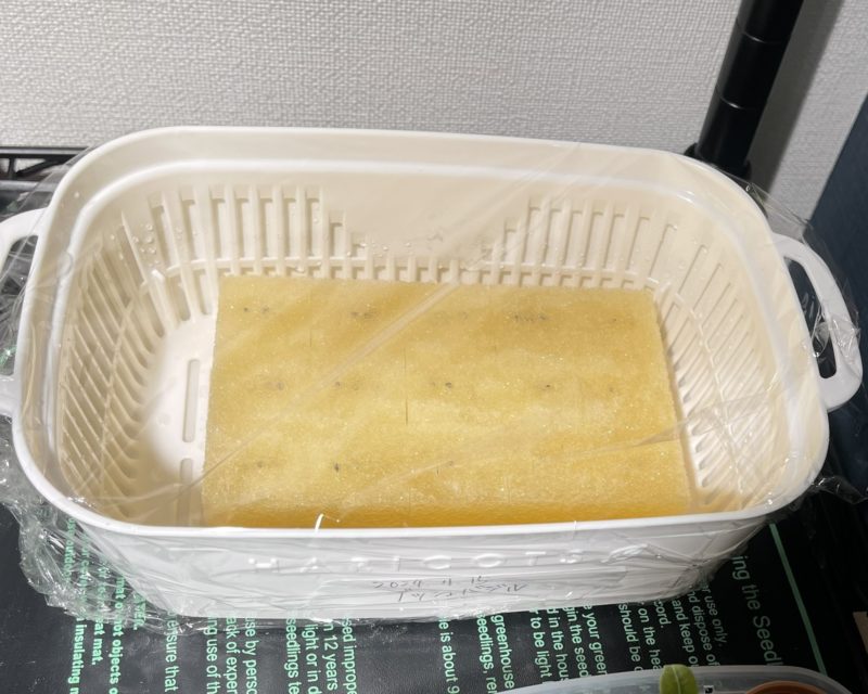 今回は育苗マットに乗せLEDライトを当てて発芽を待ちます。ラップを上にかぶせたのは保湿の為です。1日1度ラップを取り、空気の入れ替えをしてあげてください。