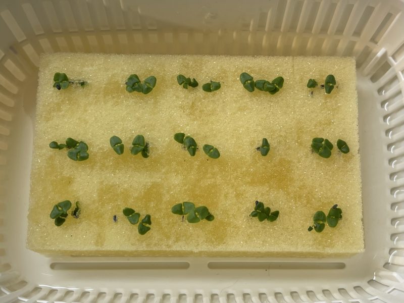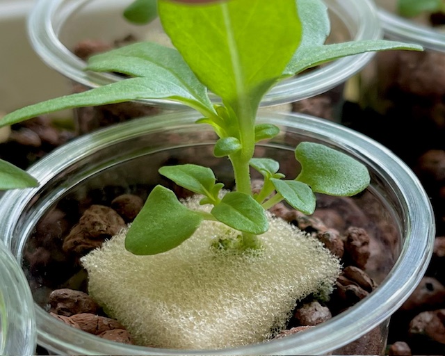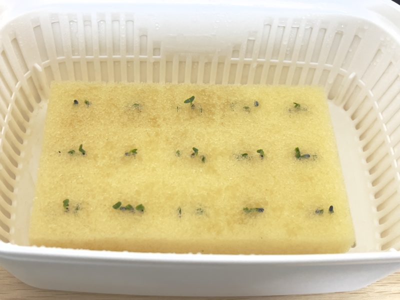 バジルは発芽に光が必要(好光性種子)の為、タネはスポンジの奥まで埋め込まず、スポンジの中央より、上に植え込みます。種同士がくっつかないように1つのスポンジに3粒埋め込んでます。