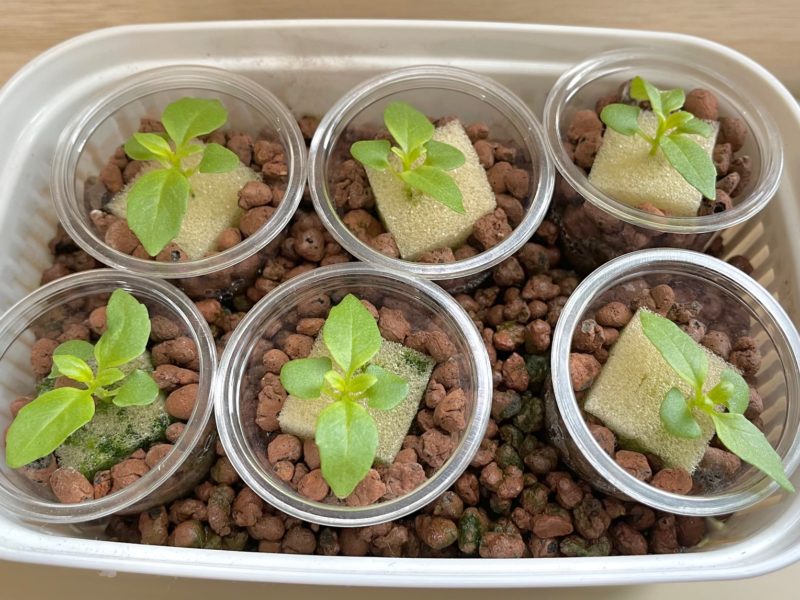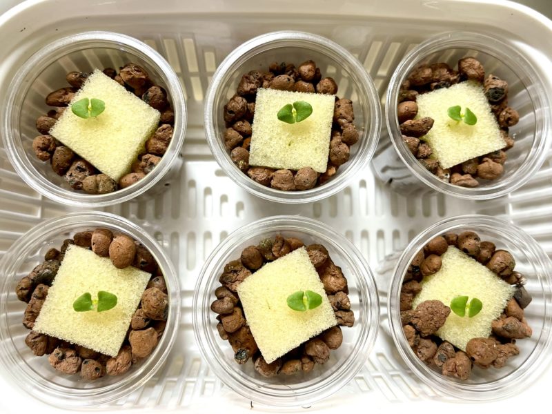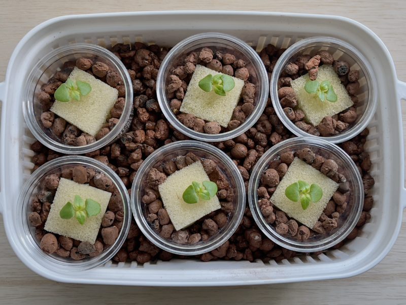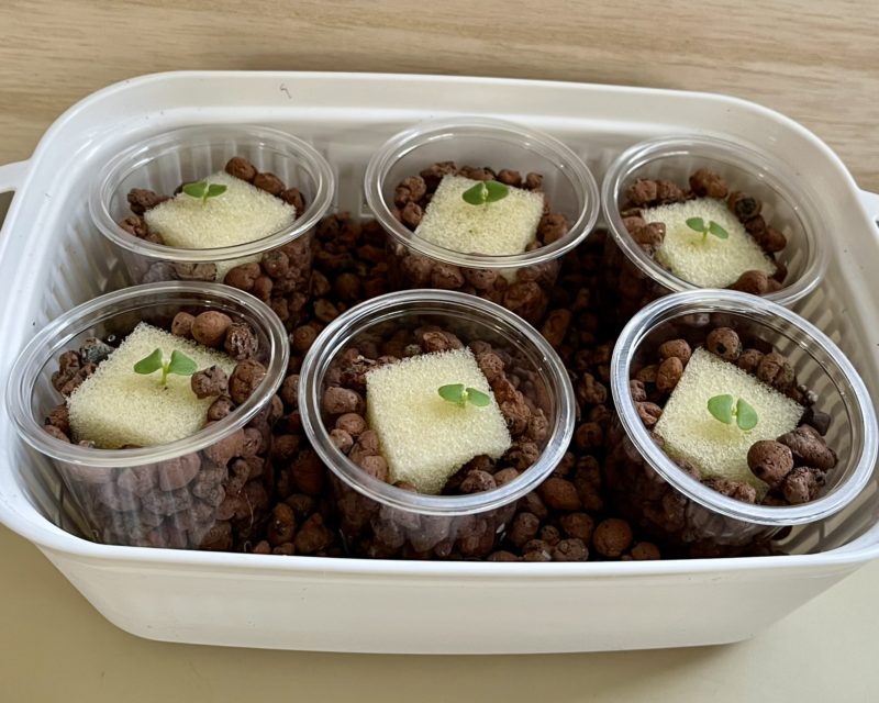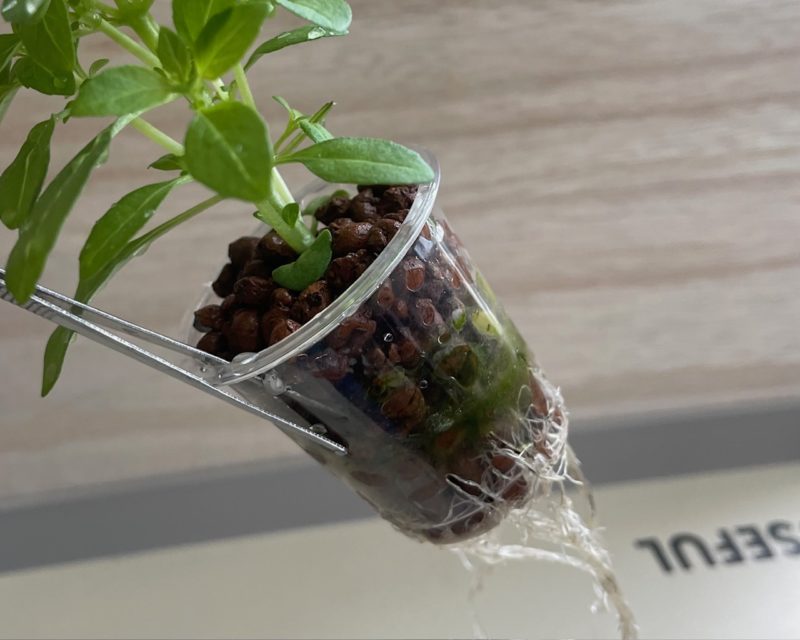 バジルの根が伸びてないので、プラスチック容器の中のハイドロボールを水で湿らせLEDライトに当てて成長を待ちます。