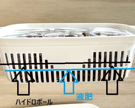 今回の場合は、豆苗トレーにハイドロボールをひき詰めてます。ザルを持ち上げ下の容器に液肥(ハイポネックス微粉1000倍希釈)をハイドロボールの位置より下に液肥が浸かるようにして日光が直接当たるのを防ぐようにしてます。