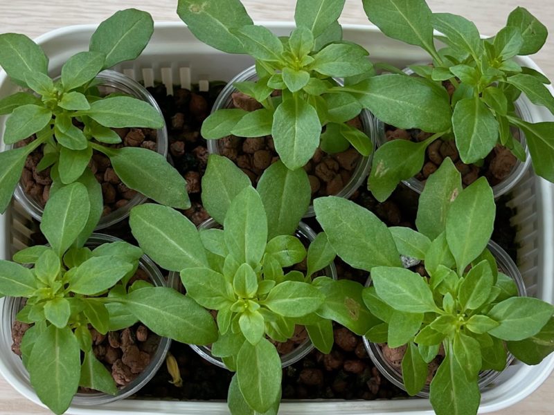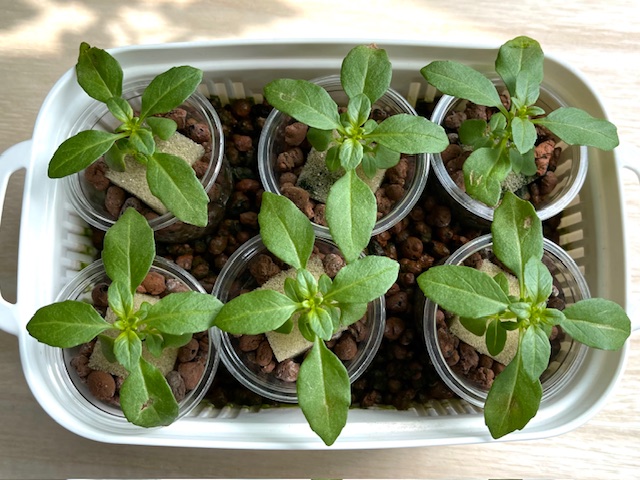 肥料は微粉ハイポネックス1000倍希釈で、十分元気に育ちます。バジルの高さが10㎝近くになると、溶液を良く吸うようになるので、毎日肥料がはいっているかチェックして水枯れしないように注意します。