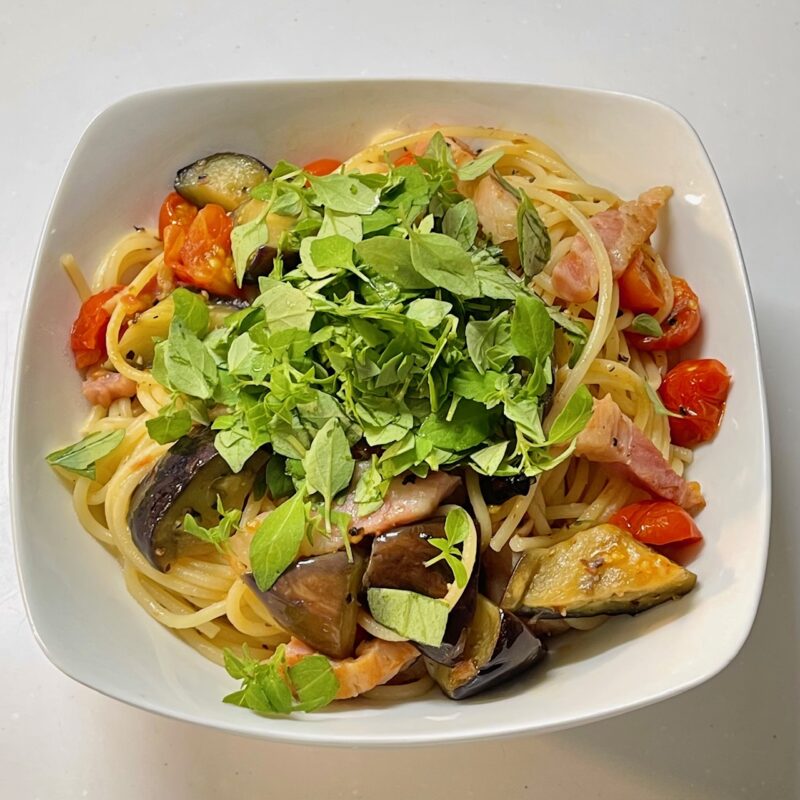 豪快に剪定したブッシュバジルを、贅沢にのせ、パスタを作りました♪
