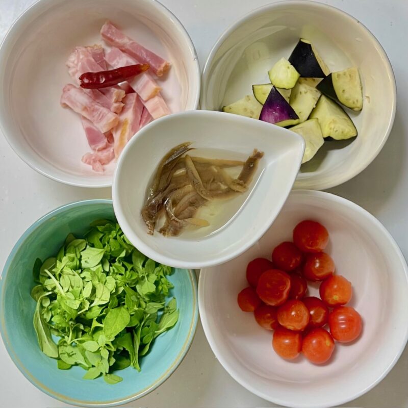 ブッシュバジルは香りが強いようですが、うちではやや控え目な味に育ってるので、たくさん食べられました。トマトは室内で育ったマンマミーアミニトマトを使って。