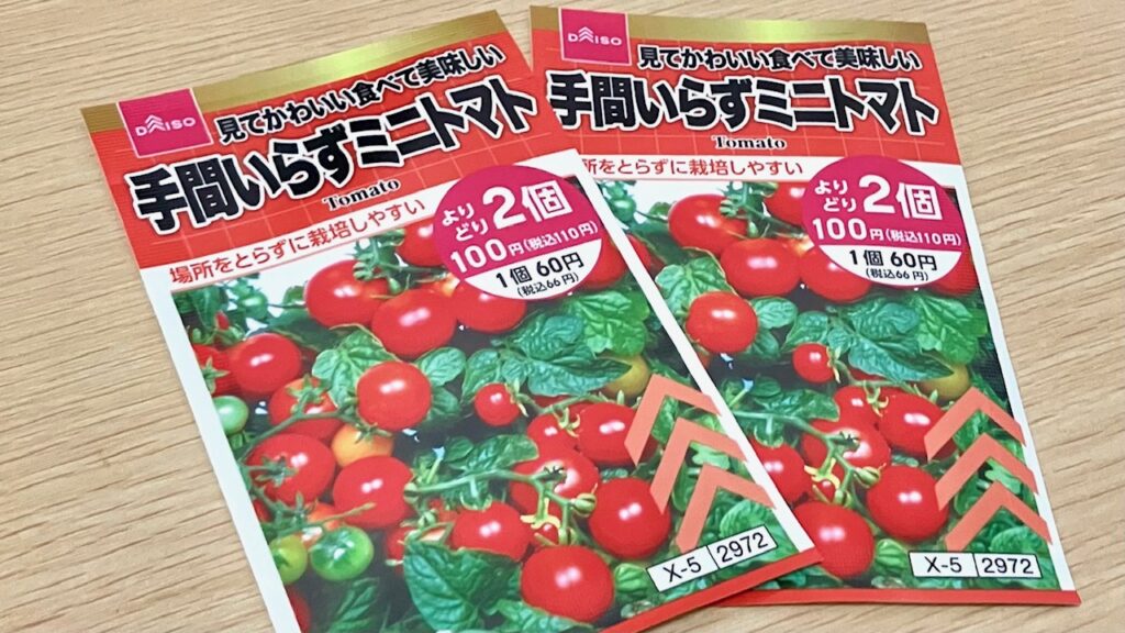 タイトルにもございます通り、昨年購入を逃してしまった矮性トマトの種、ダイソーの「手間いらずミニトマト」を数日前に購入する事が出来ました!