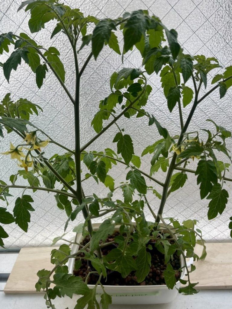 処分できず、小さい100均の豆苗トレーに植えたまま窓際で、余った液肥を入れながらここまで育ててしまいました。ここまでくるとますます処分出来ません。うちの窓は半分下が曇りガラスであります。