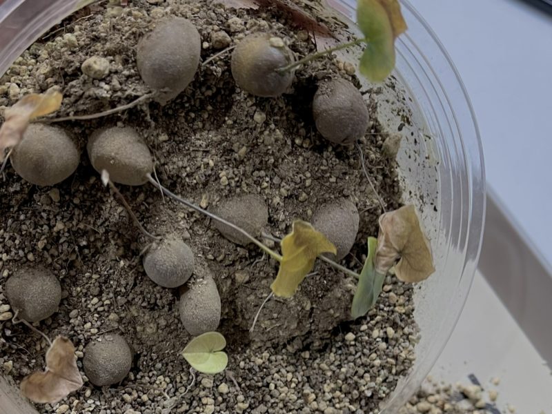 実生から約半年ほど経ちましたが、以前育てた時より成長遅め。塊根の色が土に埋まっていた割に以前よりイモ部分の色が濃いようです。