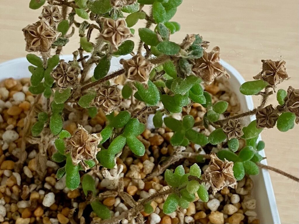 購入したドロサンテマム「紅宝石」に種がたくさん付いていて、採取してタネまきする事に。