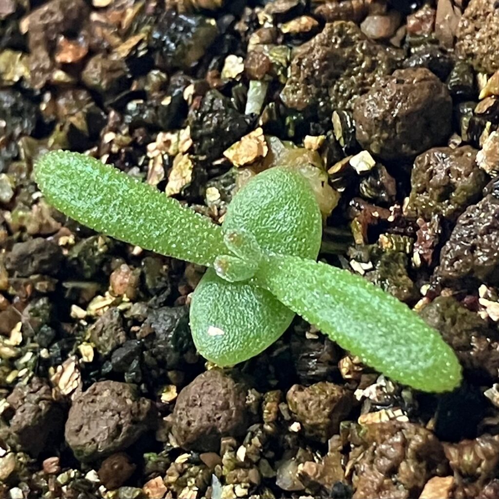 ドロサンテマムだと分かる姿になってきました!2mmほどの小さな双葉からここまでは思っていたよりスピーディーに成長するなと感じました。