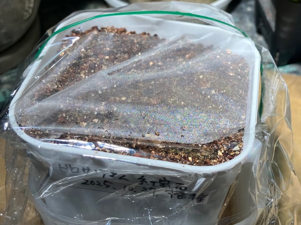 スリット鉢にブレンドした土を入れてしっかり水を与えてから、その上に種をそっと均等になりそうにばらまきました。(種を撒いた後も土と同化して全く見えません!)
