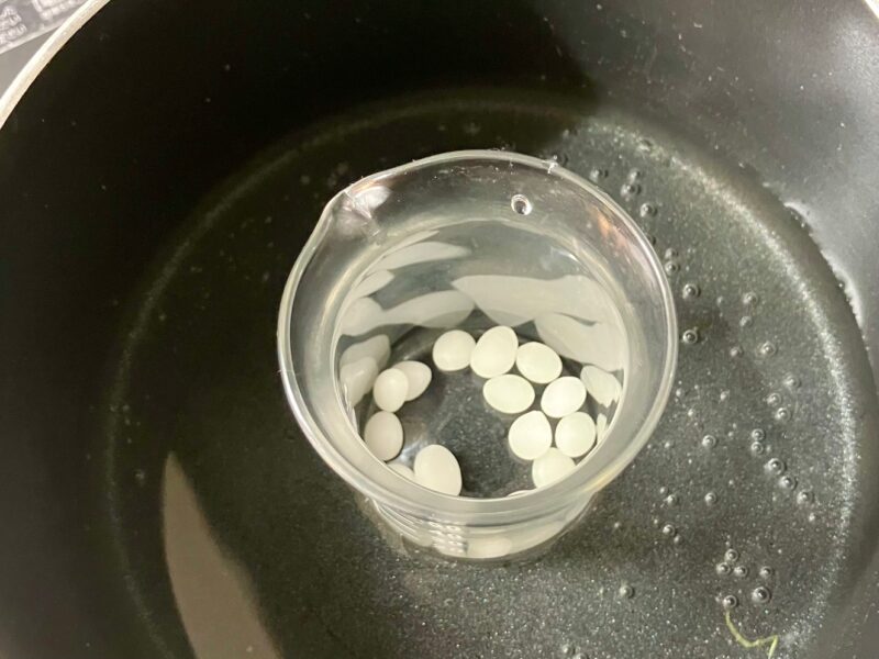 (※他のオイルと混ぜた時ダマになりやすいので、蜜蝋が液体になるまでしっかり溶かす)