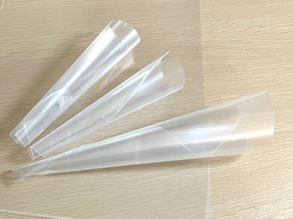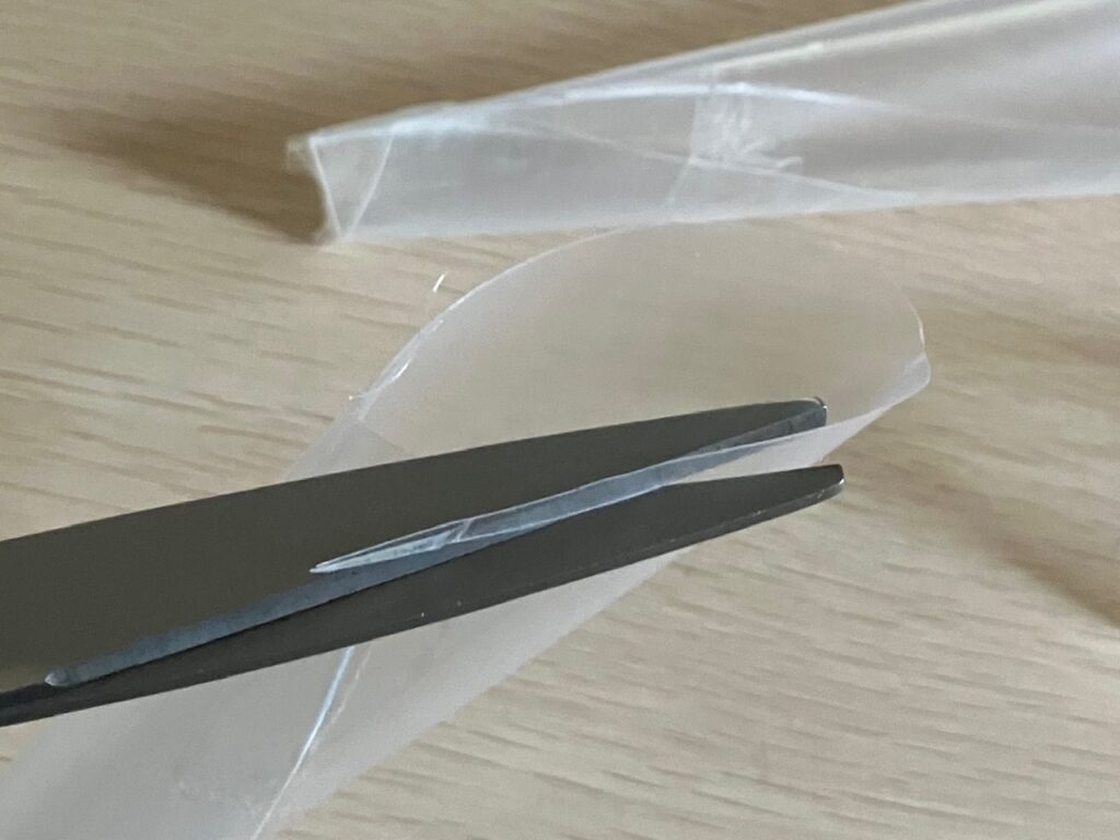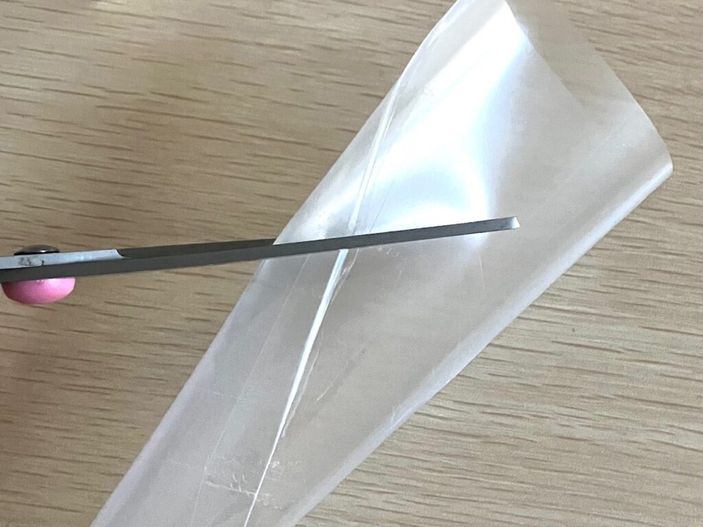 3.丸めたクリアファイル斜めにカットして、スコップの「さじ部」を好みの形に整えます。