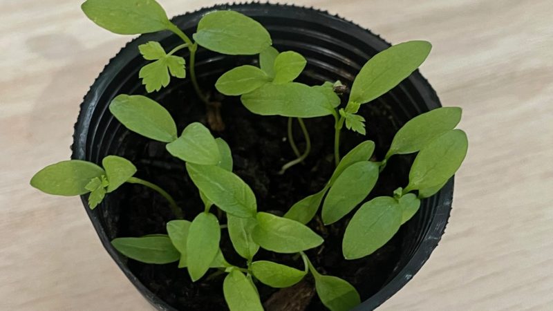 イタリアンパセリをタネから育て、セリアで揃えた土と鉢を使って植え替えをしました。