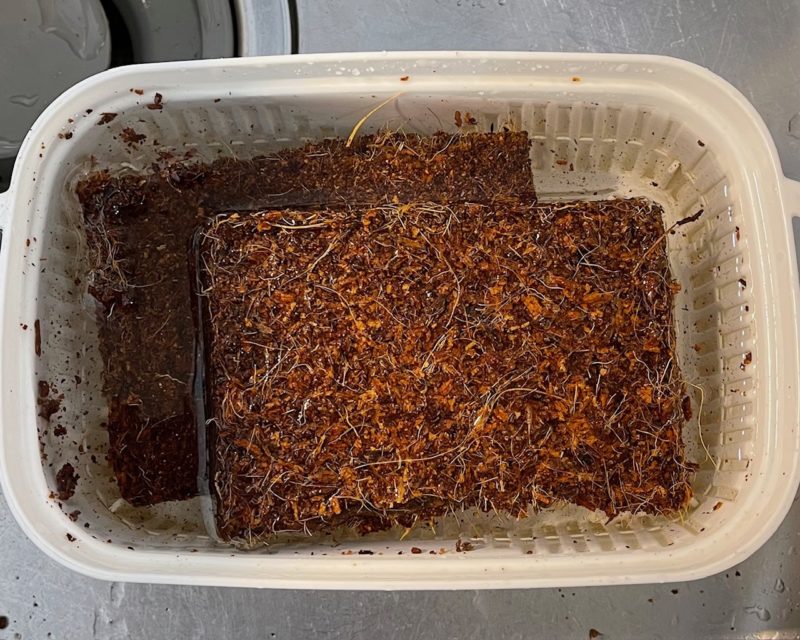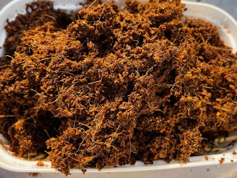 ココヤシを水に付け込み膨らませた様子です。思っていたより膨らむのが早く、20分くらいでほぐれました。