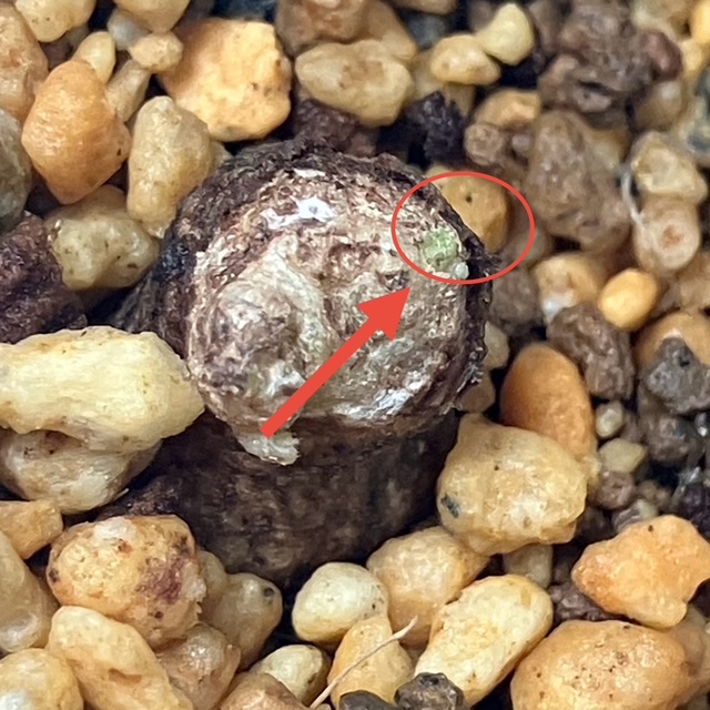 赤い矢印の部分を挿しました。ぱっと見はサトイモ科によくできるイモのようでした。