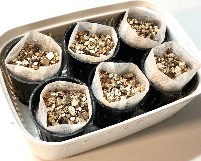 - 不織布にバーミキュライトを入れて、ネットポットに入れてセットします。
