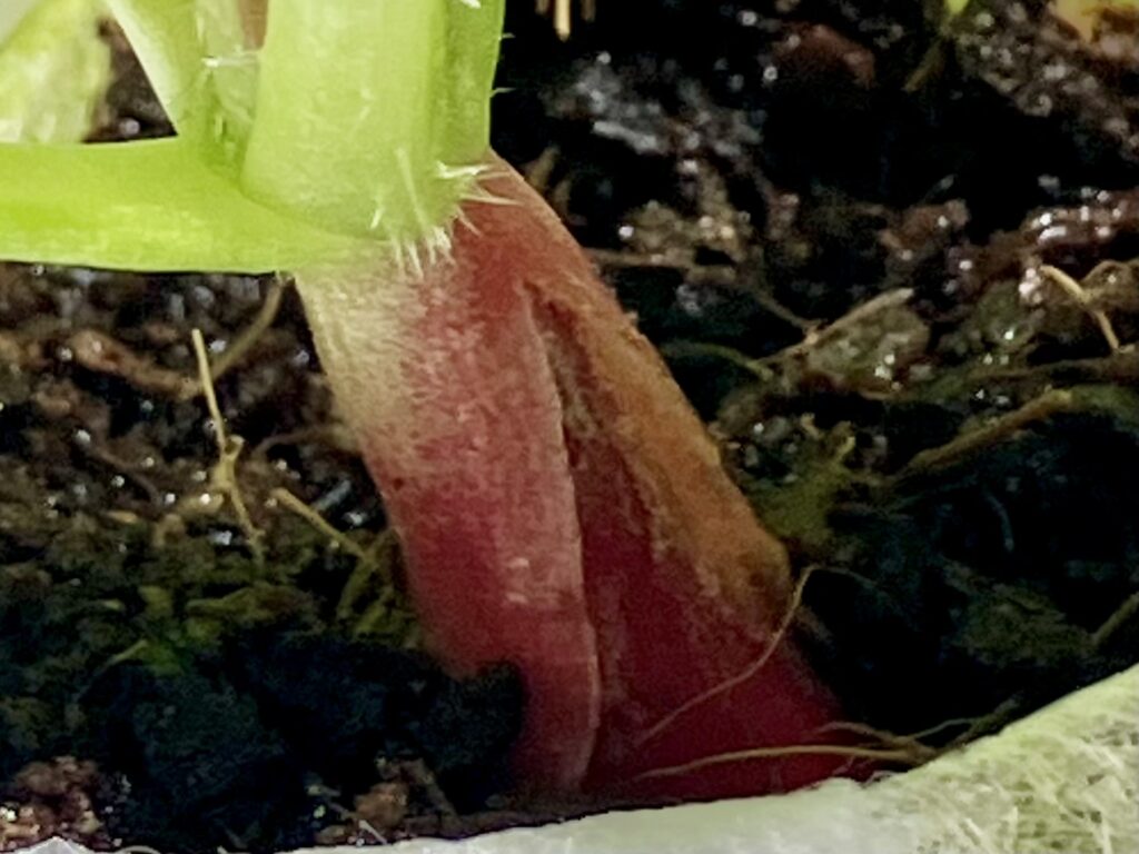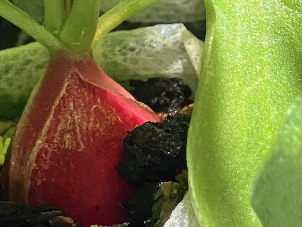 ラディッシュが膨らむ時は茎が裂けて、こんな感じで↓中から胚軸が膨らんでいきます。