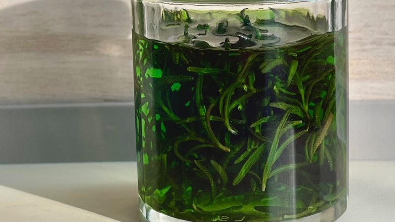 ローズマリーの色がアルコールに溶け込んでますね。